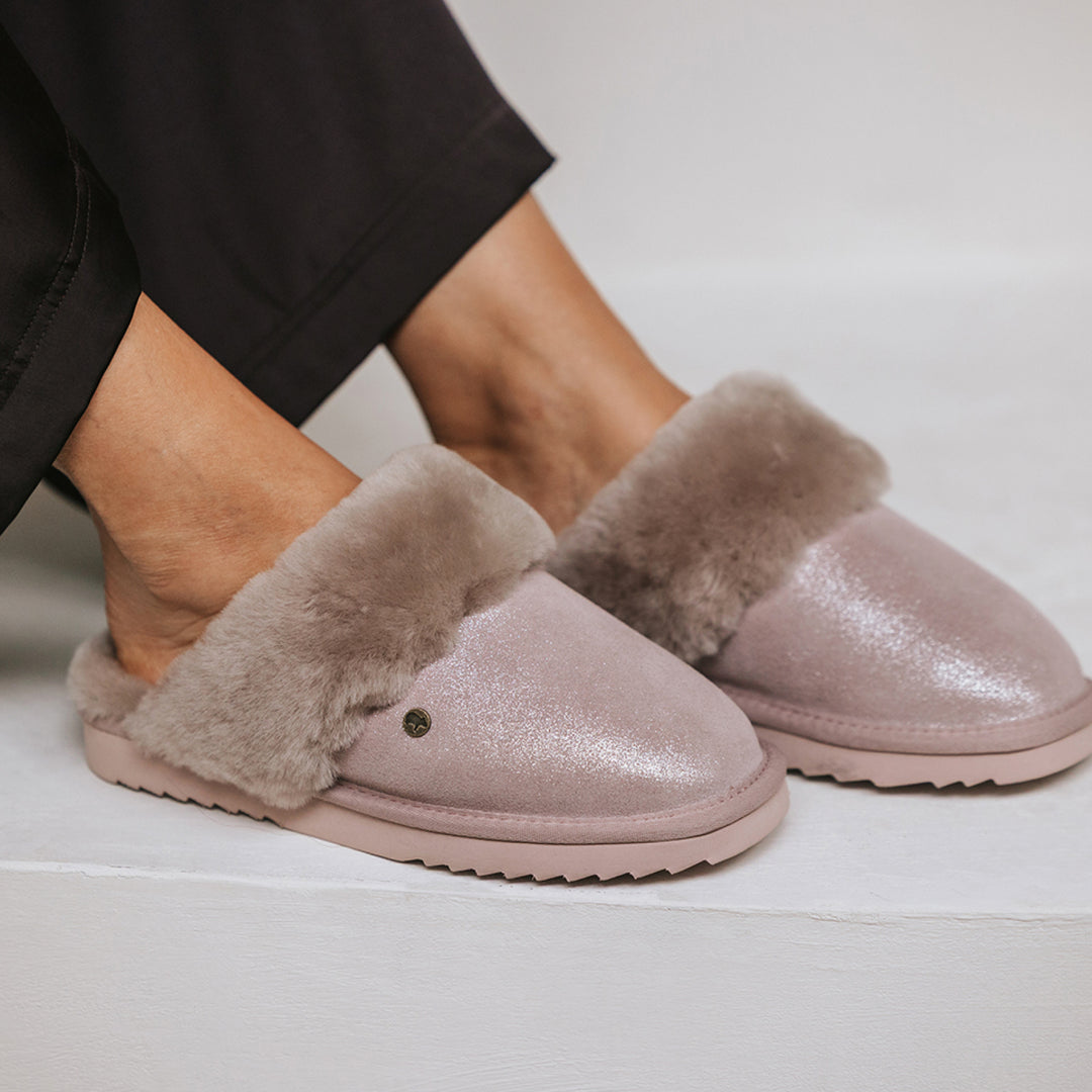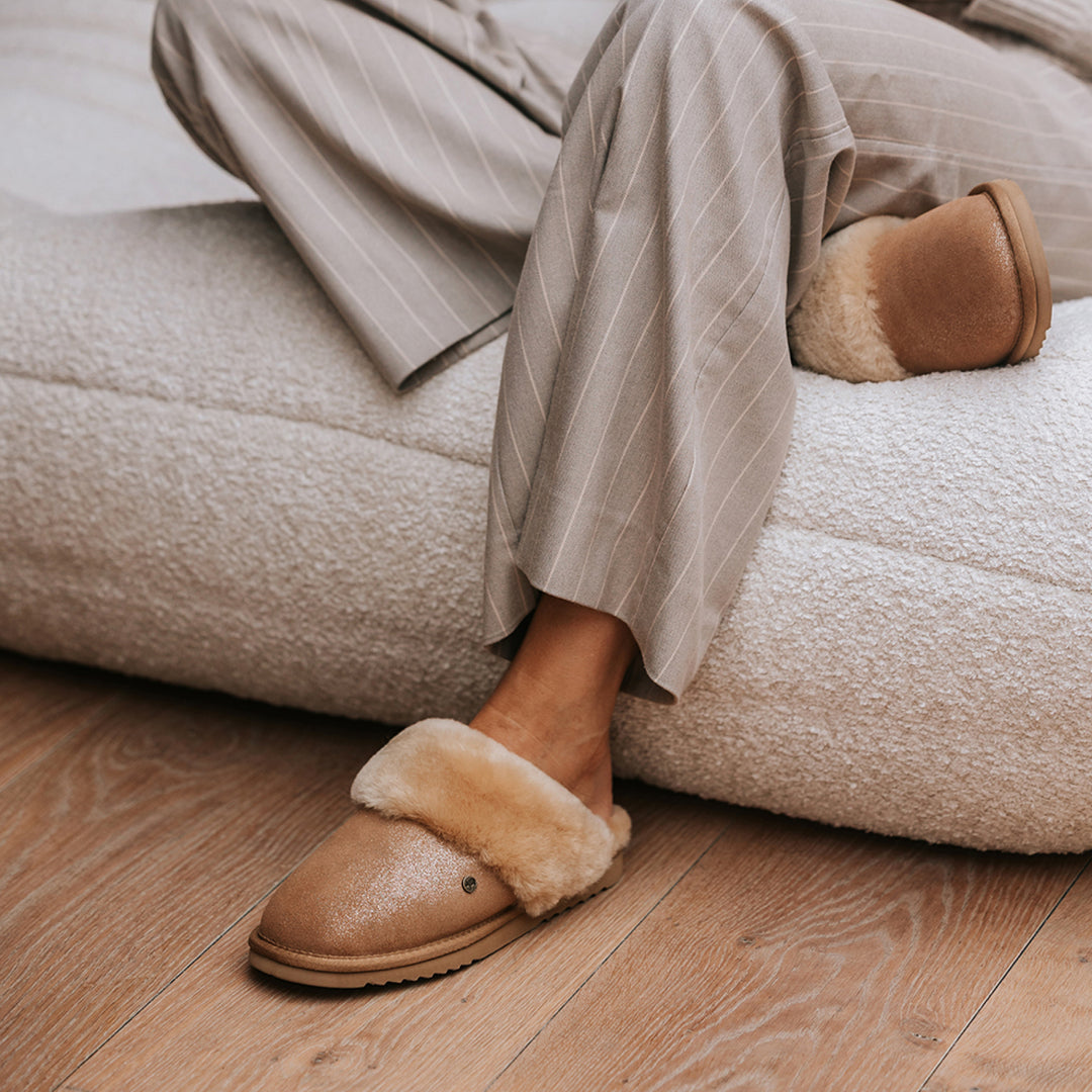 Les pantoufles Warmbat Metallic sont conçues pour les femmes qui aiment le style et la chaleur. Ces chaussons décontractés sont dotés d'une doublure intérieure douce qui procure une sensation de cocon à chaque pas. Grâce à leur cœur en laine de mouton mérinos, vos pieds restent à la température idéale. La laine est douce, résistante et thermostatique, ce qui signifie que vos pieds ne seront jamais trop chauds ou trop froids et resteront toujours au sec, quelle que soit la température ambiante.