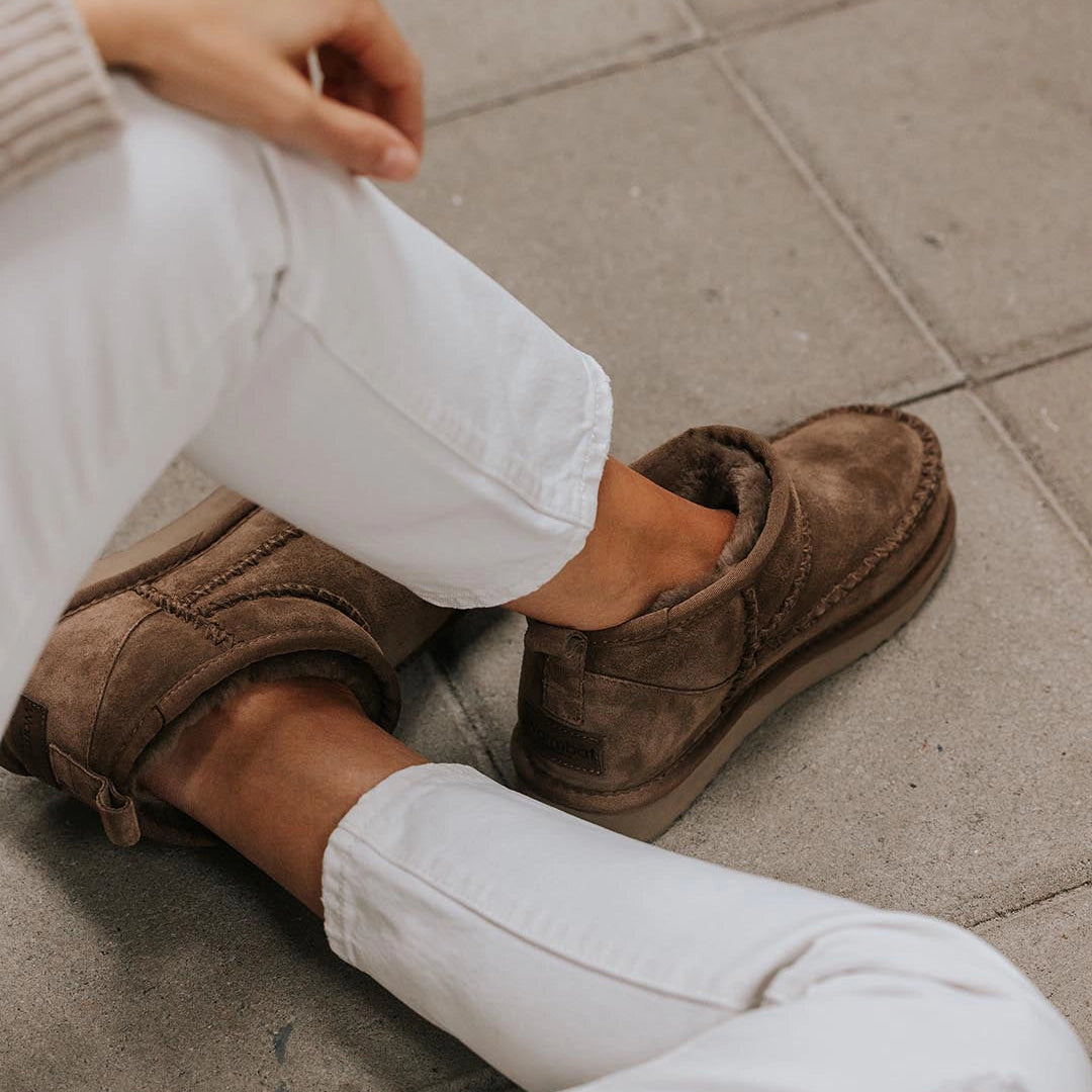 L'intérieur est doublé de laine de mouton mérinos à 100 %, pour des pieds chauds et respirants pendant les journées froides. Grâce à la semelle extérieure légère en caoutchouc, vous marchez confortablement et de manière stable, à l'intérieur comme à l'extérieur.